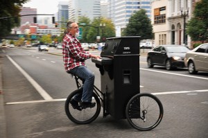 Not exactly a piano, definitely not a kid, but possibly a bike or a bike-like object here in River City. Dezy Walls has brought his singing and piano playing to the streets of Portland. You can read all about it here.